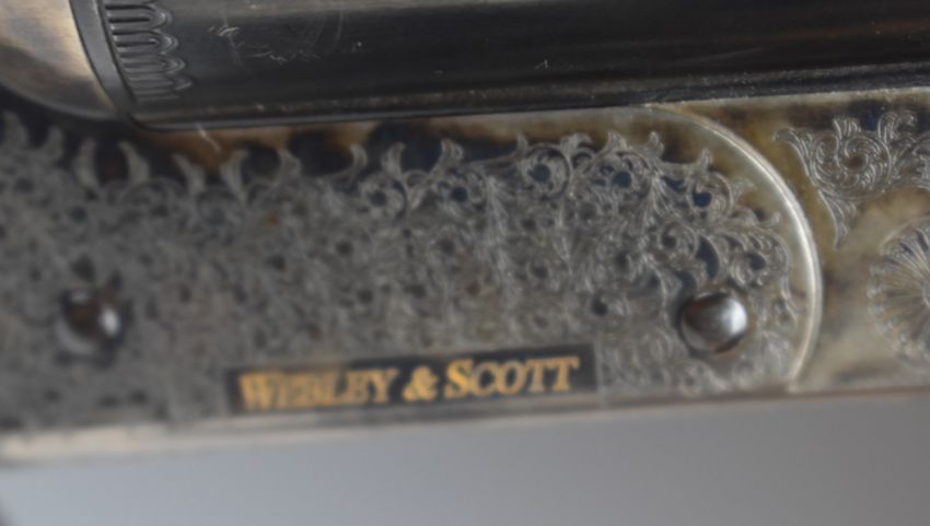 Webley & Scott 712 12 bore side by side ejector shotgun with engraved locks, trigger guard, underside, top plate, thumb lever and fences, chequered grip and forend, single trigger and 28 inch superior steel proofed barrels with 3 inch magnum chambers choked ½ and improved cylinder, overall length 115.5cm, length of pull 37cm, serial number G00131A. PLEASE NOTE THAT A VALID RELEVANT FIREARMS/SHOTGUN CERTIFICATE IS REQUIRED TO HANDLE/PURCHASE THIS ITEM.