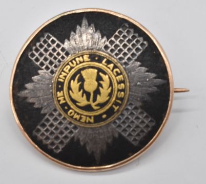 Scots Guards sweetheart badge / brooch inscribed K J C for Katherine Jane Cutler (daughter of Lt Cutler, Scots Guards) born 14 May 1904 at the Tower of London, stamped 14k verso