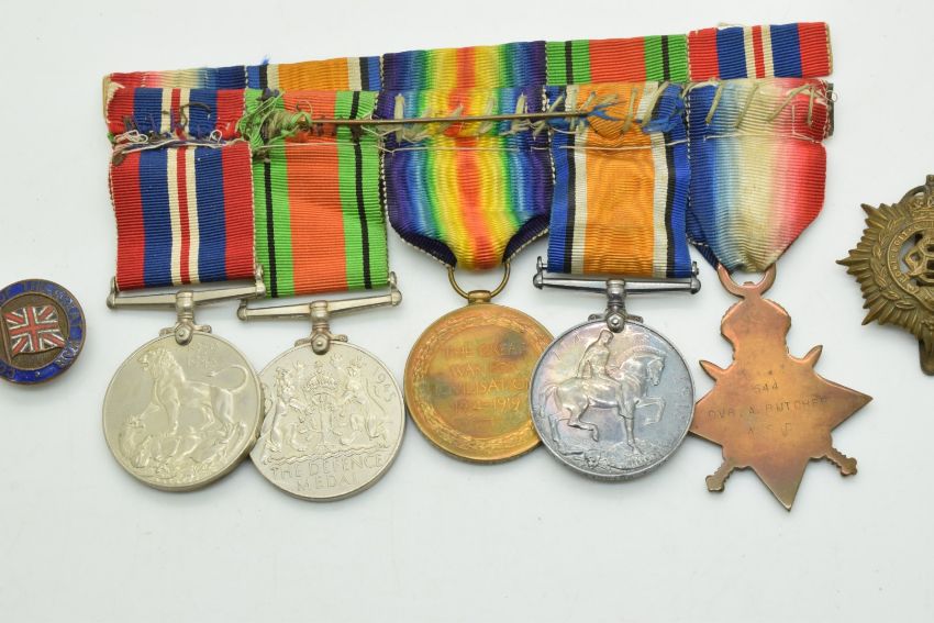 British Army WW1 and WW2  group of five medals, comprising 1914/1915 Star, War Medal and Victory Medal named to 544 Driver A Butcher, Army Service Corps, 256 to War and Victory Medals, WW2 Defence and War Medal, cap badge and Comrades of the Great War lapel badge