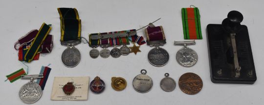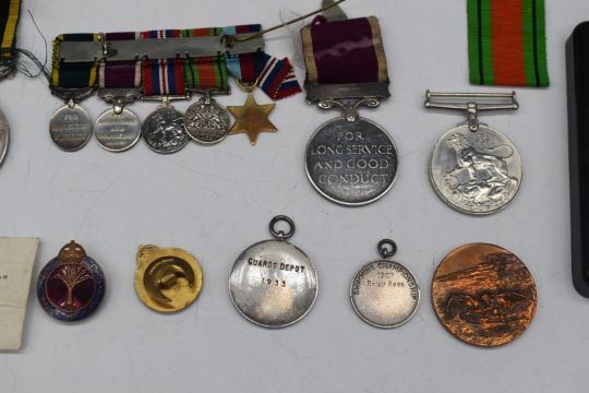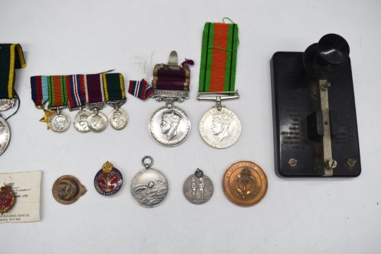 British Army WW2 medals comprising Defence Medal, War Medal, Long Service Good Conduct medal named to 2730734 Sgt WA Morgan Welsh Guards, Territorial Efficiency medal named to 2730734 Sgt WA Morgan Royal Army Ordnance Corps, miniatures, three swimming medals and three Welsh Guards Association badges, photographs and an Air Ministry Morse key