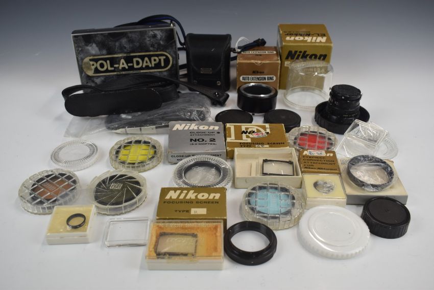 Nikon El-Nikkor 50mm f/2.8 enlarging lens in original box, Nikon Pol-a-dapt Polaroid adaptor, various Nikon accessories to include auto extension ring, focusing screens, filters etc