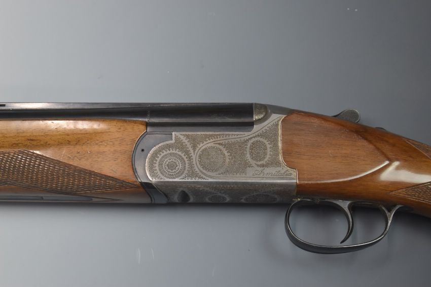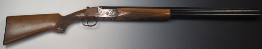 Armitalia 12 bore over and under ejector shotgun with engraved lock, underside, top plate, fences and thumb lever, chequered semi-pistol grip and forend, single trigger, vented top rib and 28 inch barrels choked ¾ and ¼, overall length 114cm, length of pull 36cm, serial number 59841. PLEASE NOTE THAT A VALID RELEVANT FIREARMS/SHOTGUN CERTIFICATE IS REQUIRED TO HANDLE/PURCHASE THIS ITEM.