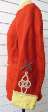British Army 'Red Coat' scarlet tunic of rough cloth with 1st Battalion Middlesex Volunteer woven shoulder titles, General Service buttons by Samuel Brothers of London, Marksman Proficiency badge to sleeve and part Samuel Brothers Ltd London paper label with Hornsey recorded under regiment title, size small