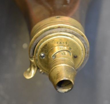 Sykes copper and brass powder flask with embossed leaf decoration to both sides, 18cm long.