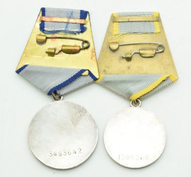 Two Russian medals, one for valour, numbered 3483642 to reverse, the other for combat, numbered 1295388 to reverse
