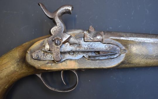 Percussion hammer action pistol with engraved miquelet lock, brass butt plate and 9 inch smooth bored barrel stamped 'F. De. Fran. Go. Maiztegue. Plagengia', overall length 38cm.