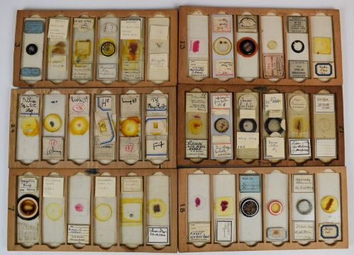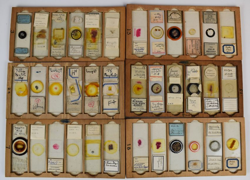 One hundred and forty eight Victorian and later glass microscope slides including Walthamstow Technical Institute, insects, plants, Rowsell Exford, photographic curiosity of the Great Eastern at sea, C. Baker London, in wooden box with trays, width 21cm