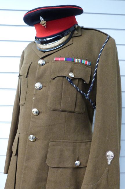 Two British Army khaki No 2 dress uniforms, one for the Rifles Regiment with Colonel rank insignia and medal ribbon, the other for the Army Education Corps with Lt Colonel rank, medal ribbon and hat