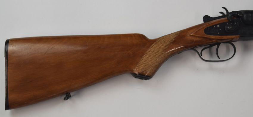 Baikal T03-66 12 bore side by side hammer action shotgun with engraved scenes of birds and dogs to the locks, chequered semi-pistol grip and forend, sling mounts, double trigger and 28 inch barrels choked ¾ and full, overall length 115.5cm, length of pull 38cm, serial number P12462. PLEASE NOTE THAT A VALID RELEVANT FIREARMS/SHOTGUN CERTIFICATE IS REQUIRED TO HANDLE/PURCHASE THIS ITEM.