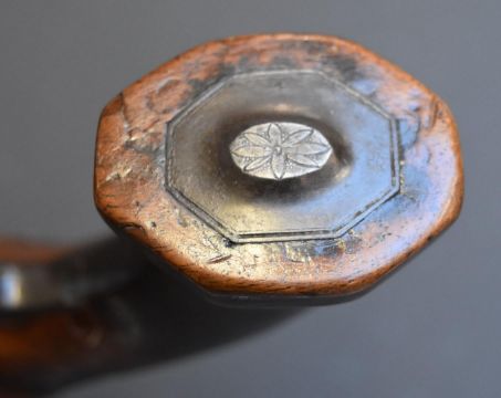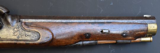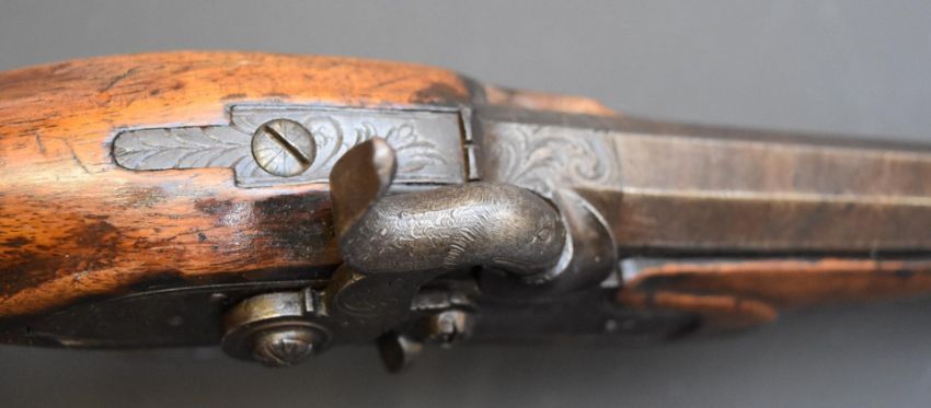French percussion hammer action holster pistol with engraved lock, hammer, trigger guard, butt plate and mounts, chequered grip, brass tipped wooden ram-rod and 7.5 inch octagonal barrel, overall length 35cm.