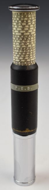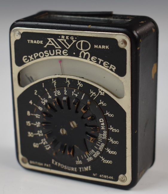 Otis King spiral slide rule in original box, slide rule and an AVO exposure meter in original box