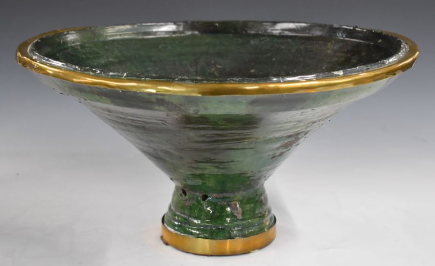 A pair of 18th/19thC Hispano Moresque green glazed pedestal bowls with metal mounts, diameter 44, H22cm