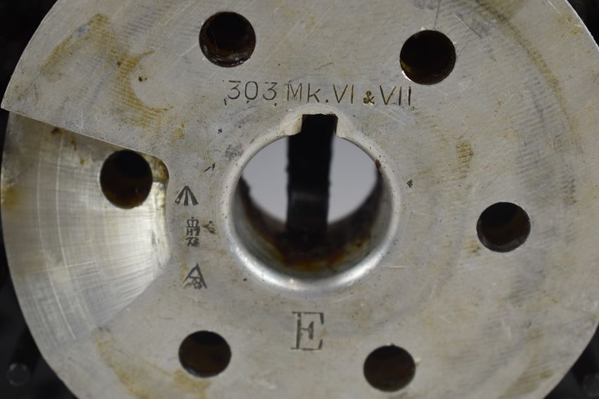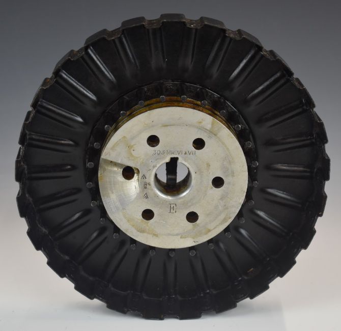Lewis .303 machine gun 47 shot disc or tray magazine with internal alloy mount stamped '.303 Mk. VI & VII', 20.5cm in diameter.