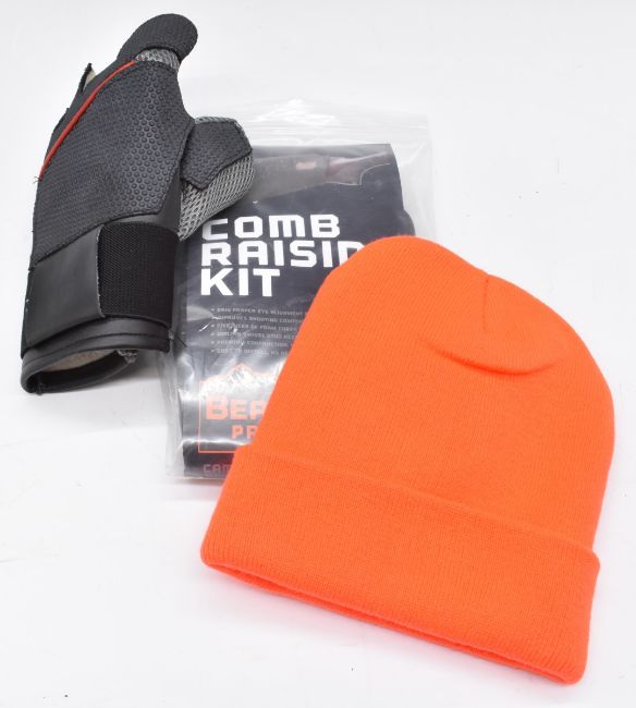A collection of shooting and gun accessories including scope mounts, lens covers, rifle cartridge boxes, cartridge pouches, gun lock, shotgun comb raising kit etc