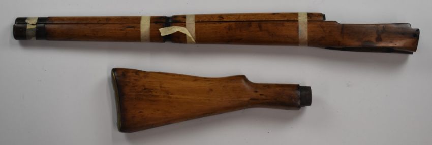 Short magazine Lee Enfield bolt-action rifle stock with storage compartment to the brass butt plate and metal forend tip, 105cm long.