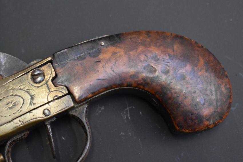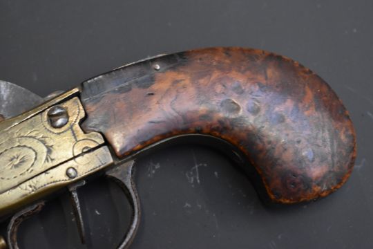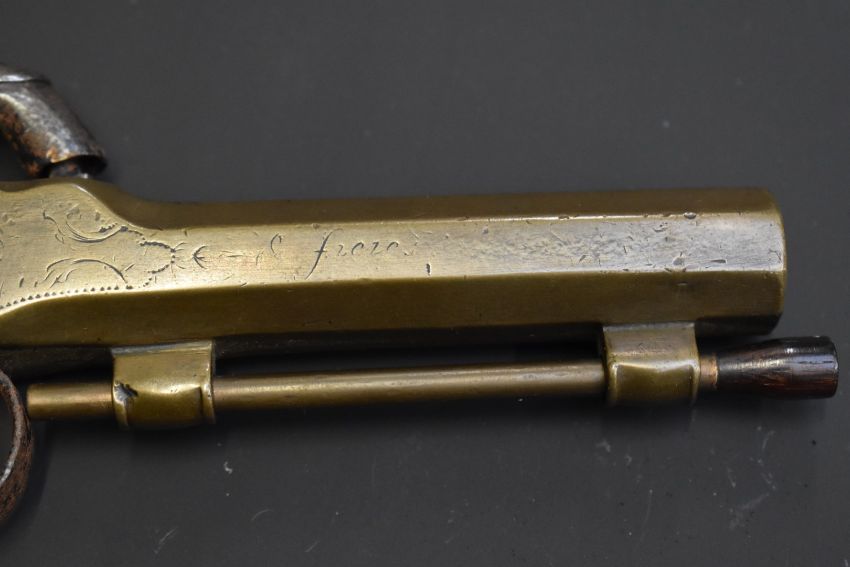 Brass percussion hammer action pocket pistol with engraved frame, walnut grips, wooden tipped brass ram-rod and 3.5 inch indistinctly named octagonal smooth bored barrel, overall length 20.5cm.
