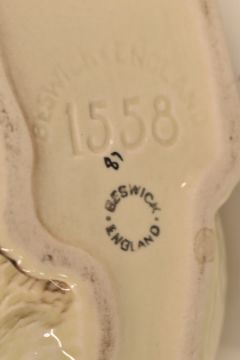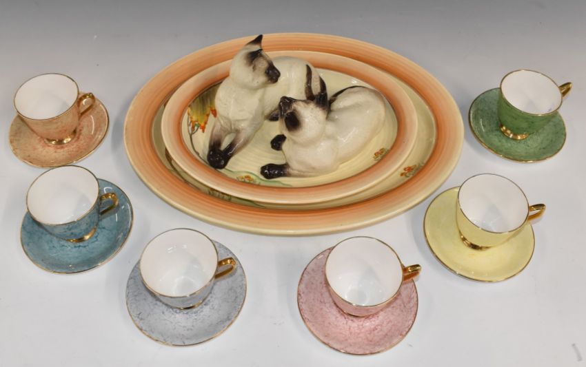 Two Clarice Cliff oval meat plates, largest 41 x 31cm, pair of Beswick Siamese cats nos 1558 and 1559, and six Royal Albert harlequin 'Gossamer' cups and saucers