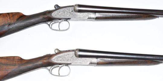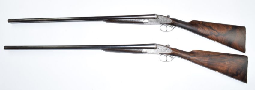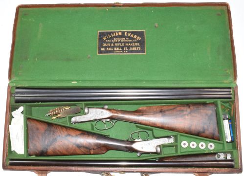 A pair of William Evans best quality 12 bore sidelock side by side ejector shotguns each with named locks, fine scrolling engraving to the locks, underside, trigger guard, top plate, thumb lever, butt plate and fences, chequered grip and forend, inset gold cartouche to the underside of the stock, double trigger and named 30 inch barrels choked ½ and improved cylinder, overall lengths 121cm, length of pull 38.5cm, serial numbers 13931 and 13932, in original fitted leather double gun case with 'William Evans Gunmakers to HRH Duke of Connaught KG Gun & Rifle Makers, 63 Pall Mall, St James's, London SW'. Originally made for Captain W M Hungerford Pollen and consigned by a direct descendant. Included in the lot are photocopies of the original William Evans Ltd order book showing purchase price and the company records of Captain Pollen's measurements, taken for fitting the gun.  PLEASE NOTE THAT A VALID RELEVANT FIREARMS/SHOTGUN CERTIFICATE IS REQUIRED TO HANDLE/PURCHASE THIS ITEM.