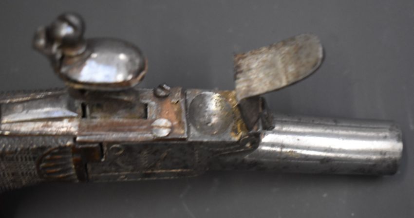 French flintlock pocket pistol with engraved lock, folding trigger, chequered grip, thumb slide safety and 2 inch smooth bored barrel, overall length 15.5cm.