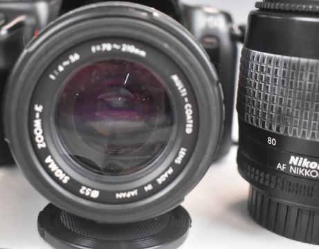 Halina AI TLR camera in leather case, Brownie cine camera, Nikon F50 SLR camera with Sigma 1:4-5.6 70-210mm, Nikon 35-80mm 1:4-5.6 and Tokina 28mm 1:2.8 lenses