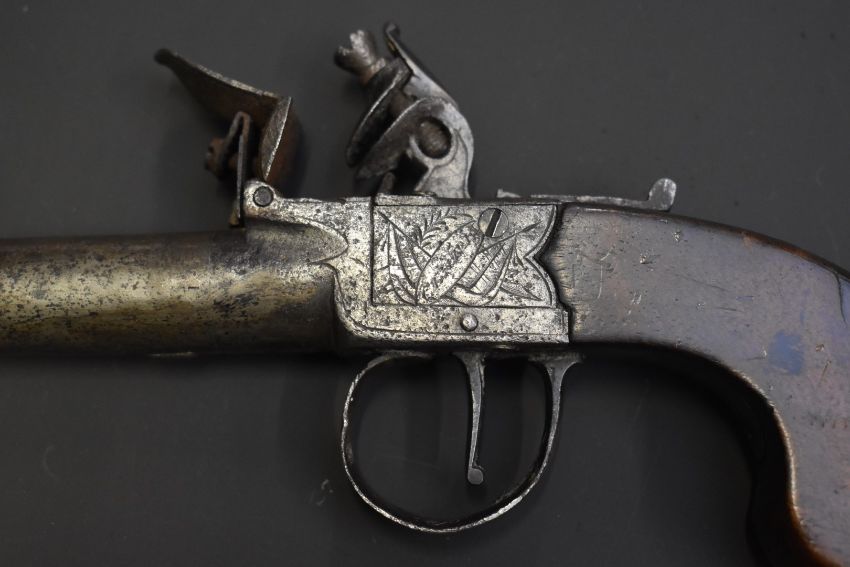 Clark of London flintlock hammer action pocket pistol with named and engraved locks, shaped wooden grips, thumb slide safety and 1.5 inch turn off barrel, overall length 15.5cm.