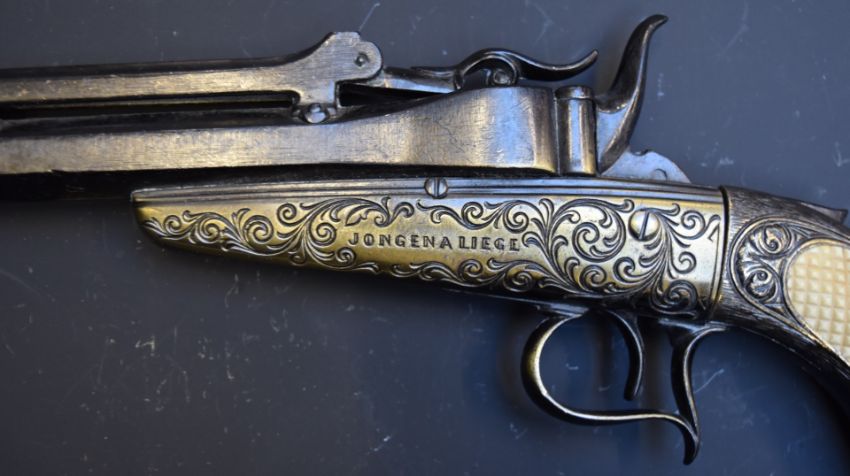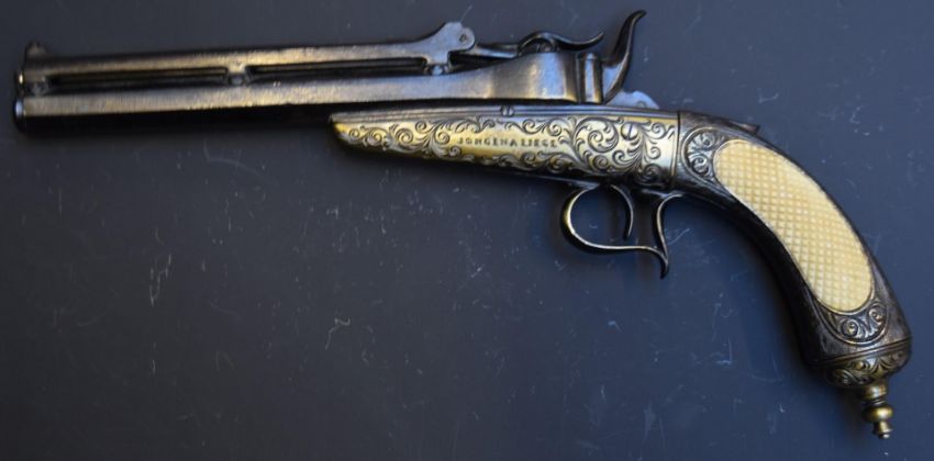 Jongen style percussion hammer action pistol with ornate decoration, faux ivory grips and 8 inch barrel, overall length 36cm.
