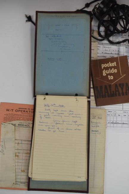 Royal Navy observer's notebook and aircraft W/T 1945/1946 Log, from HMS Simbang RNAS Singapore together with a later W/T operator's log, US Navy ship identification chart, pocket guide to Malaya, copy documentation and a set of headphones APW621