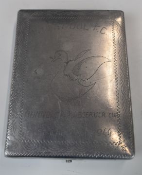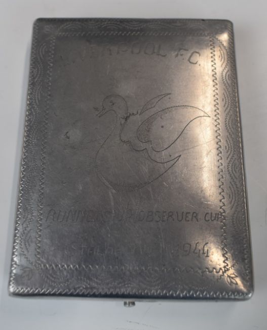 WW2 British Prisoner of War memorabilia comprising football programme with named teams for 'Liverpool' and 'Newport' dated June 10th 1944, wall plaque/shield for 'Liverpool FC' inscribed with the team names and Stalag IVB Observer Cup, Runners Up 1944, together with a hand crafted cigarette case with team names engraved to back. All previously owned by Harold 'Spud' Taylor who played for Grimsby Town FC after the war.