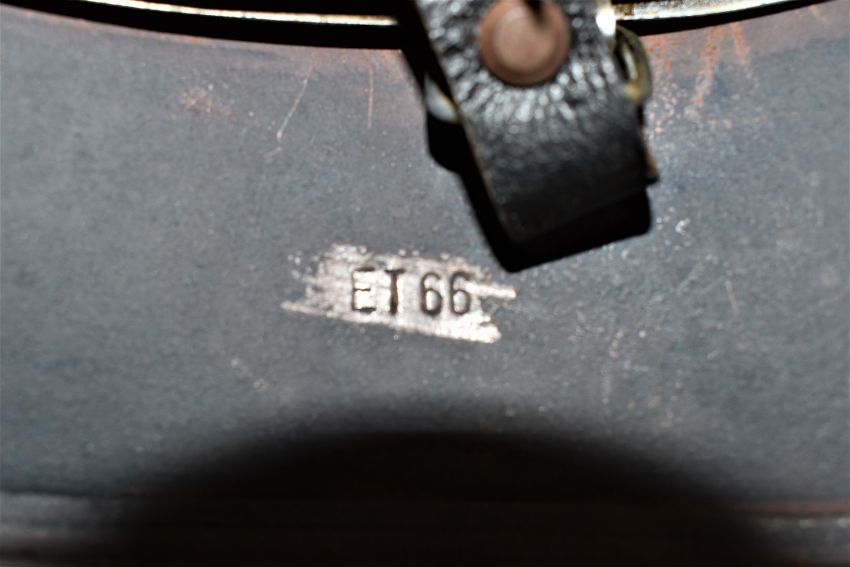 Probable WW2 manufactured German steel helmet with later lining and replacement decals, stamped ET66 and 7100 to inner rim