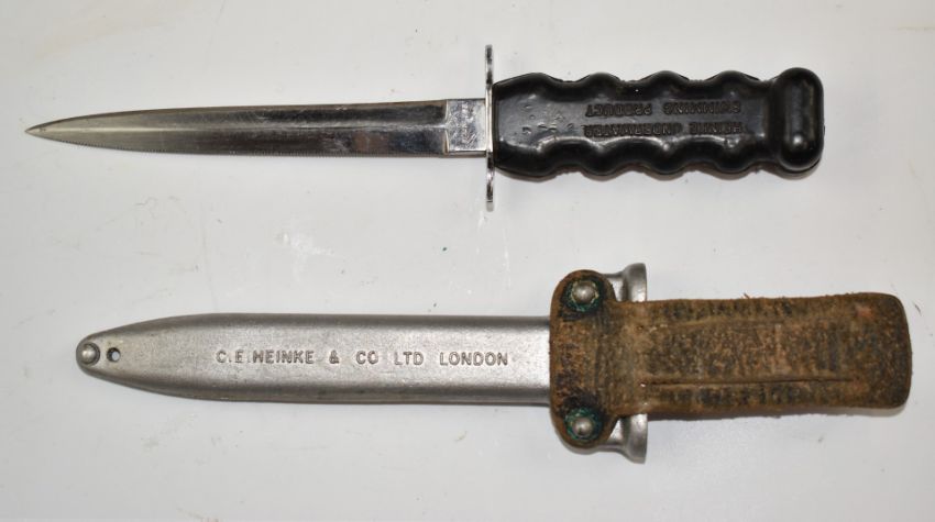 Heinke underwater swimming knife with rubber handle, 15cm double edged blade, one edge serrated, cast alloy sheath and leather belt attachment. PLEASE NOTE ALL BLADED ITEMS ARE SUBJECT TO OVER 18 CHECK ON COLLECTION OR DELIVERY