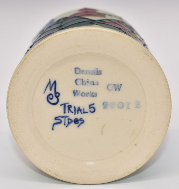 Dennis Chinaworks covered circular box decorated with violets, 'Trial 5' and '2001' to base, H8cm