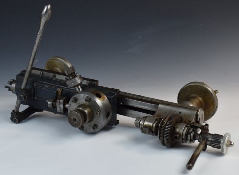 Pultra Webster & Whitcombe style 8mm watchmaker's lathe, with capstan type tailstock, overall length approximately 55cm