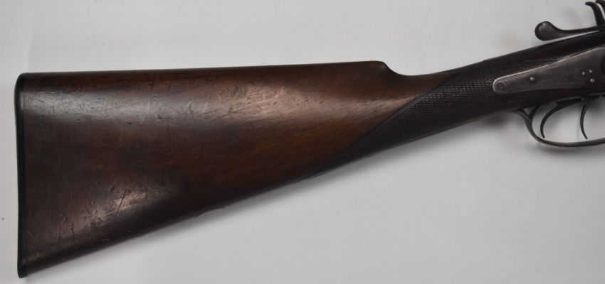 Darlow 12 bore side by side hammer action shotgun with chequered grip and horn tipped forend, vacant cartouche to the underside of the stock, double trigger and named 30 inch Damascus barrels choked improved cylinder and ¼, overall length 117cm, length of pull 36cm, serial number 1201. PLEASE NOTE THAT A VALID RELEVANT FIREARMS/SHOTGUN CERTIFICATE IS REQUIRED TO HANDLE/PURCHASE THIS ITEM.