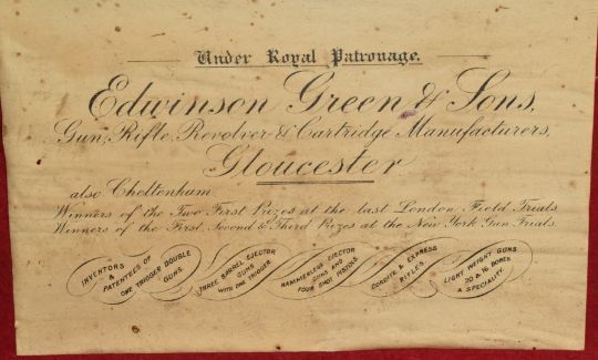 Leather and canvas bound shotgun case with fitted interior and 'Under Royal Patronage Edwinson Green & Sons Gun, Rifle, Revolver & Cartridge Manufacturers, Gloucester also Cheltenham, Winners of the Two First Prizes at the last London Field Trials, Winners of the First Second & Third Prizes at the New York Gun Trials' label, 81x22x9cm.