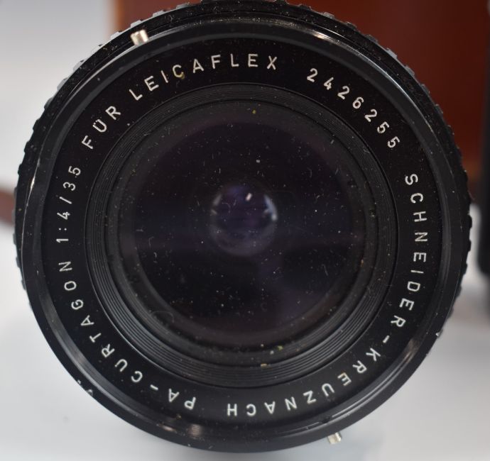 Leicaflex SL2 35mm SLR camera, circa 1974/5, with Summicron 1:2/50 and Schneider-Kreuznach Curtagon 1:4/35 lenses, original case, instructions and carry case