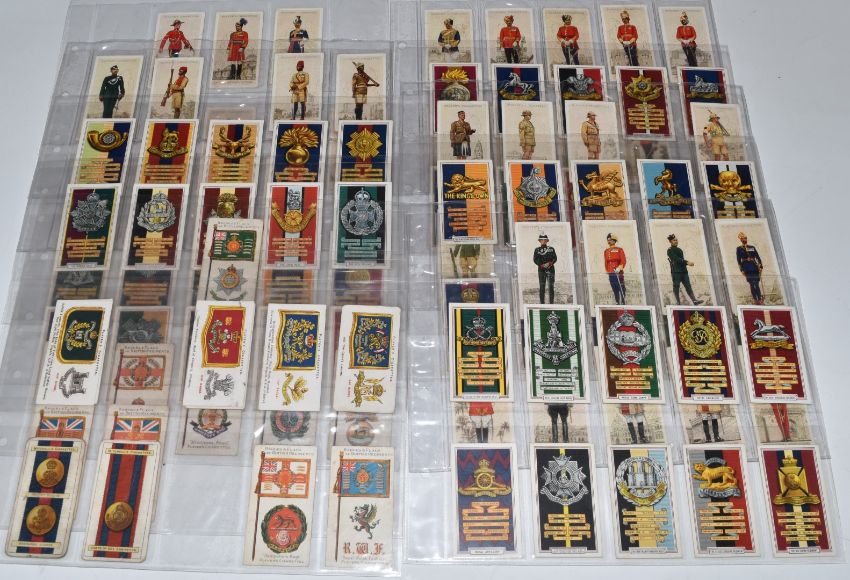 Approximately one hundred John Player's cigarette cards featuring military uniforms and cap badges of the British Army