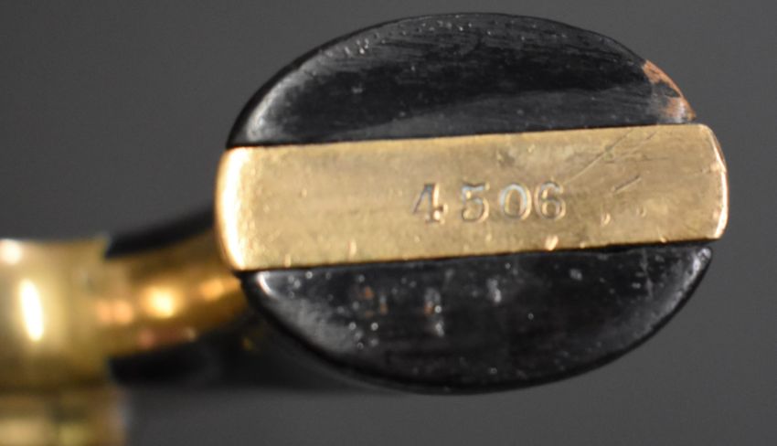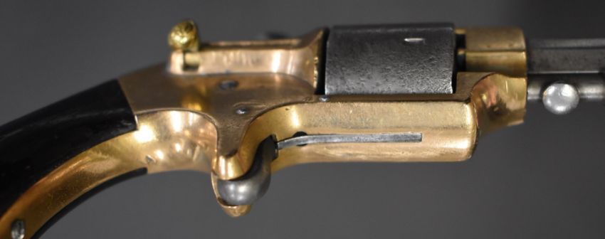 Merwin & Bray .30 five-shot single-action front-loading cup-fire revolver with sheath trigger, brass frame, cylinder marked 'Patented July 12. 1859 & July 21. 1863' brass frame and 3.5 inch rifled octagonal barrel stamped 'Merwin & Bray Fire-Arms Co NY', overall length 20.8cm, serial number 4506, in fitted wooden box with powder flask, accessories and 'Colt's Manufacturing Company LLC' label.
