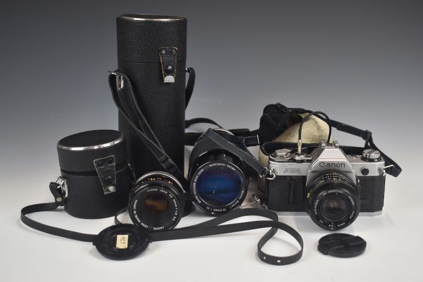Canon AE1 35mm SLR camera with Vivitar 28mm 1:2.8, Canon 50mm 1:1.18 and a Vivitar 70-210 1:3.5 lenses
