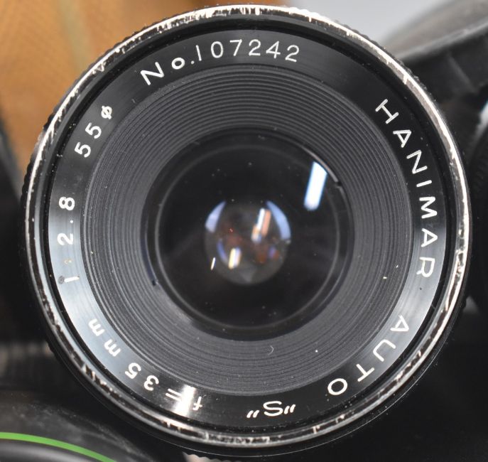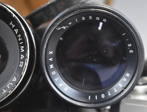 Three SLR cameras, lenses and accessories to include Edixa-mat Kadette with 1:2.8/50 lens, Praktica MTL 5B with 1.8/50 lens, Yashica Electro AX with 3.5/30 lens, Prinz Galaxy 1:6.3 400mm, Promura 28mm 2.8, Optomax 135mm 1:3.5, Unitor 1:2.8 135mm, Soligor 1:4.5 250mm, Hanimex 1:3.3 200mm and Hanimar 35mm 1:2.8 lenses