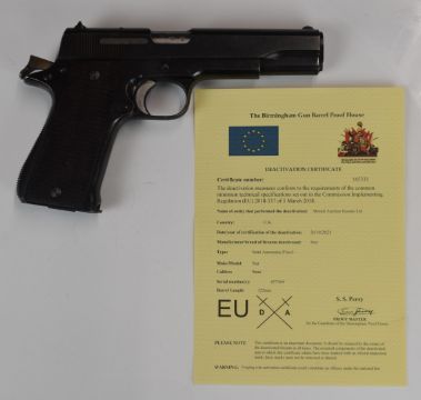 Deactivated Star 1935 Belgian 9mm semi-automatic pistol with chequered wooden grips, serial number 457369, with deactivation certificate dated 26/10/21.