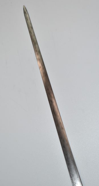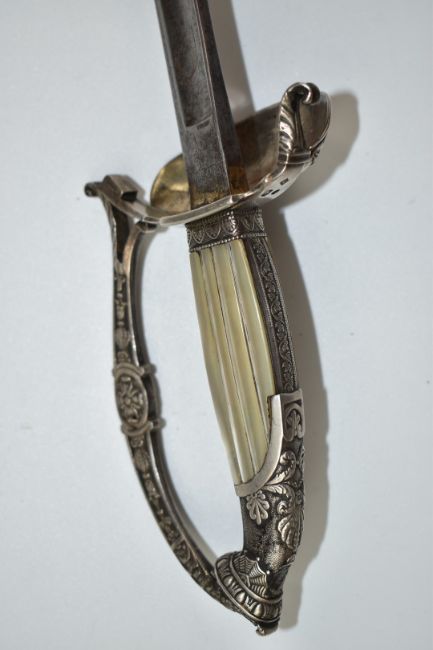 French hallmarked silver presentation sword with mother of pearl grip, ornately decorated knuckle guard, pommel and disk guard with French inscription that translates as 'from the Grenadiers of the 1st Battalion 7th Legion to Capitain de la Chaussé, December 1815', with 83cm fullered blade and leather scabbard. PLEASE NOTE ALL BLADED ITEMS ARE SUBJECT TO OVER 18 CHECK ON COLLECTION OR DELIVERY
