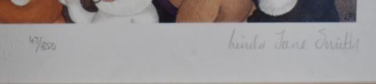 Linda Jane Smith signed limited edition 47/850 triptych novelty cat print 'O' Sole Meow', centre image 44 x 32cm, in gilt frame