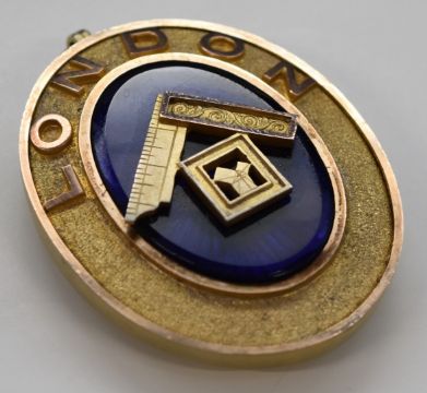 George V hallmarked silver gilt and blue enamel Masonic 'London' jewel or medal, London 1929, maker Toye & Co, L6.5cm, in original fitted case, named Barfoot to inside of lid