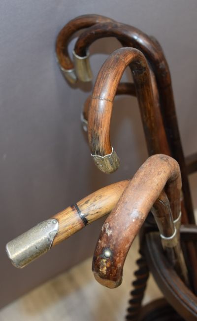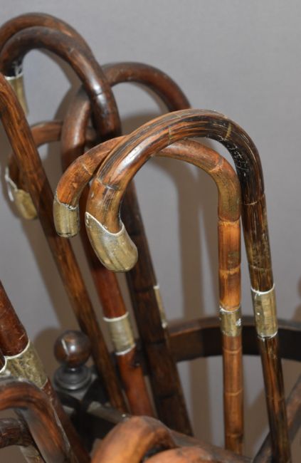 Seventeen late 19thC /20thC walking canes, most with hallmarked silver / white metal mounts, in a stick / umbrella stand with drip tray