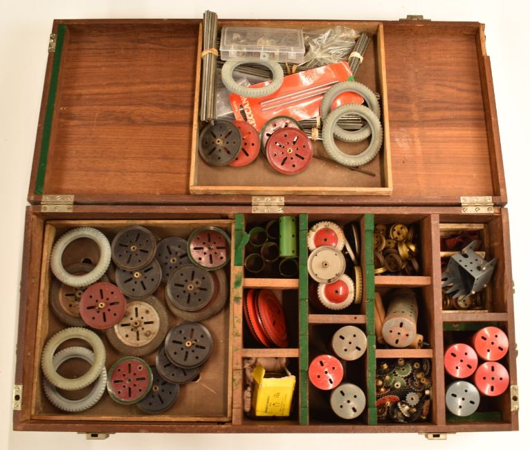 A collection of loose Meccano parts including digger bucket, wheels, gears, bearings, boilers, chain wheels, sacks etc, in a fitted wooden box