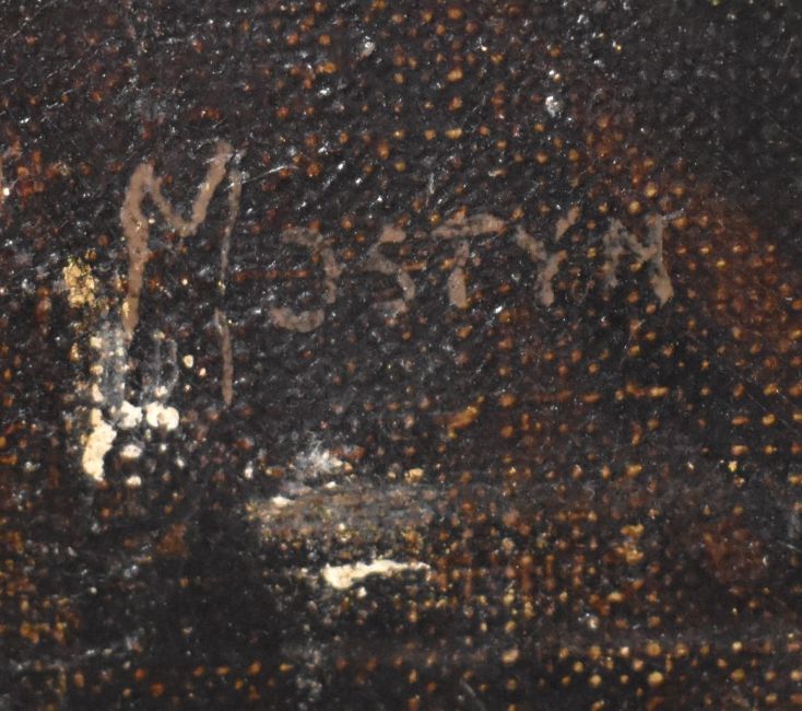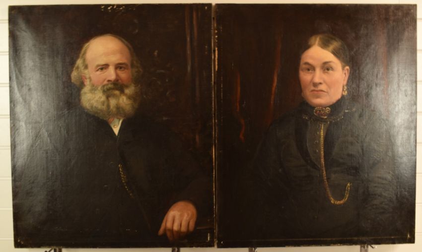 Pair of Victorian oil on canvas portraits lady and gentleman, ex The Old Vicarage, Haresfield, Nr Stroud, Gloucestershire, one signed Mostyn (possibly Tom Mostyn, 1864-1930), each 76 x 63cm