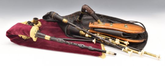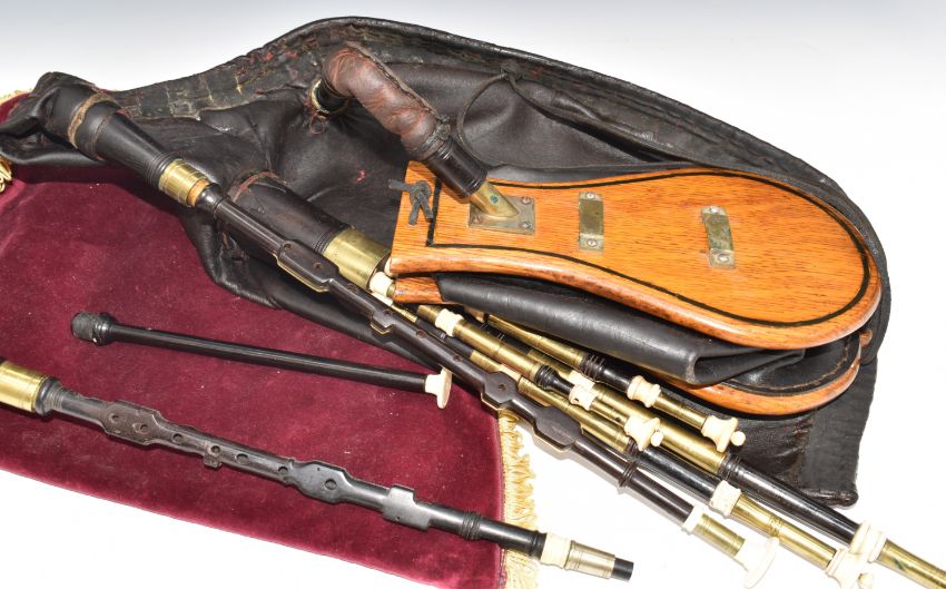 Northumbrian hardwood small pipes with brass fittings, with many accessories, 'Heritage Small Pipes' business card, reeds etc, in original had Rexine covered carry case