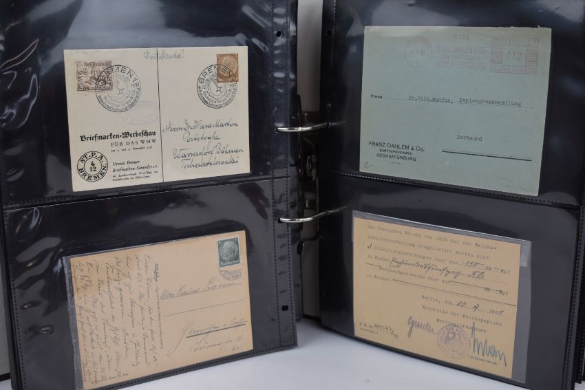 A collection of German and DDR postal history in three folders, from early issues to post WW2 including WW2 POW and military field postcards, Zeppelin covers, mint and used minisheets etc