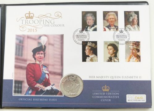 2015 QEII limited edition 65 of 250 'Trooping the Colour' 1oz silver coin cover, in Westminster presentation folder with certificate of authenticity.