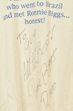 Ronnie Biggs signed T-shirt with his card giving a Rio de Janeiro address